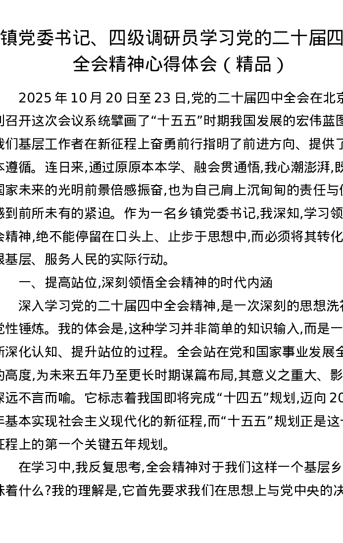 镇党委书记、四级调研员学习党的二十届四中全会精神心得体会