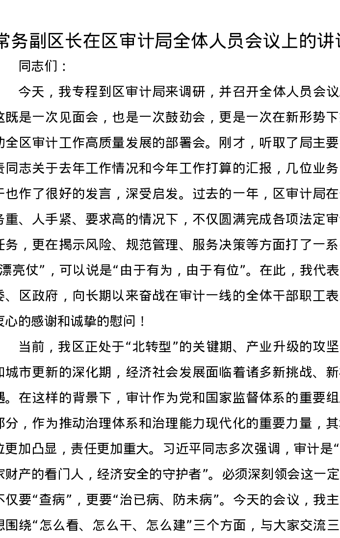 常务副区长在区审计局全体人员会议上的讲话