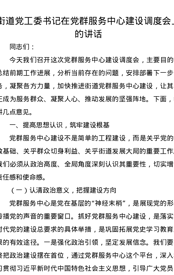 街道党工委书记在党群服务中心建设调度会上的讲话