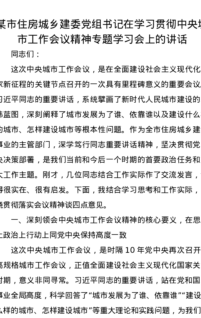 某市住房城乡建委党组书记在学习贯彻中央城市工作会议精神专题学习会上的讲话