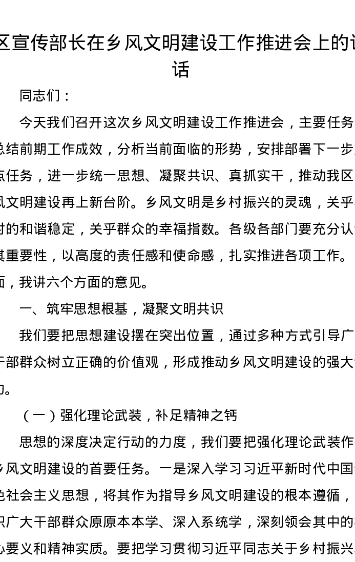 区宣传部长在乡风文明建设工作推进会上的讲话