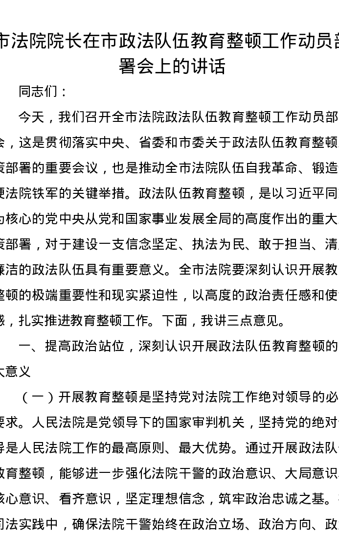 市法院院长在市政法队伍教育整顿工作动员部署会上的讲话