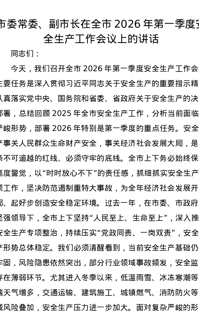 市委常委、副市长在全市2026年第一季度安全生产工作会议上的讲话