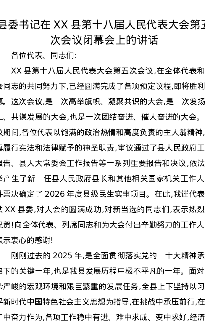 县委书记在XX县第十八届人民代表大会第五次会议闭幕会上的讲话