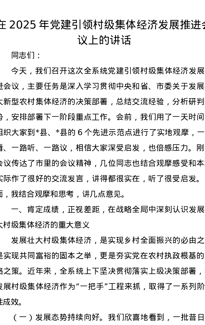 在2025年党建引领村级集体经济发展推进会议上的讲话