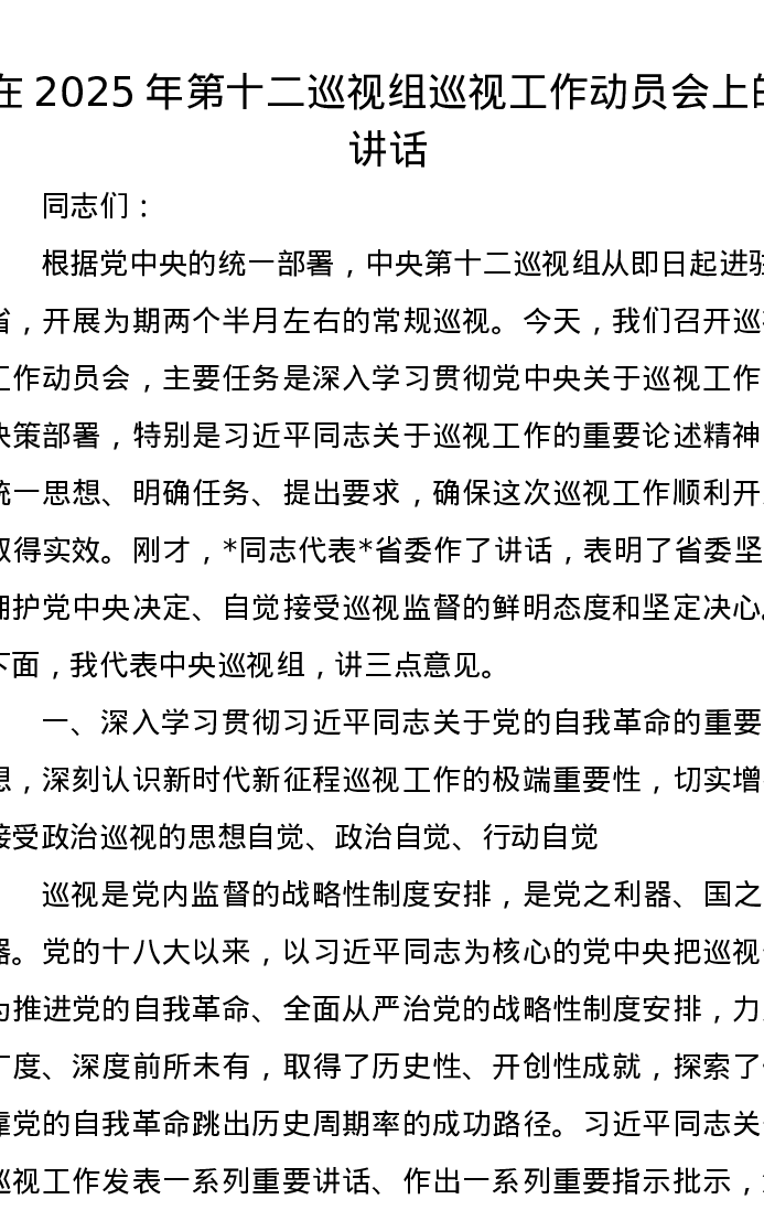 在2025年第十二巡视组巡视工作动员会上的讲话