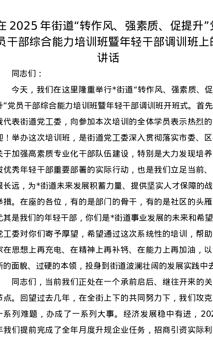在2025年街道转作风、强素质、促提升党员干部综合能力培训班暨年轻干部调训班上的讲话