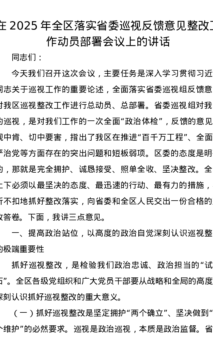 在2025年全区落实省委巡视反馈意见整改工作动员部署会议上的讲话