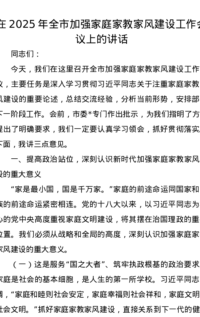 在2025年全市加强家庭家教家风建设工作会议上的讲话