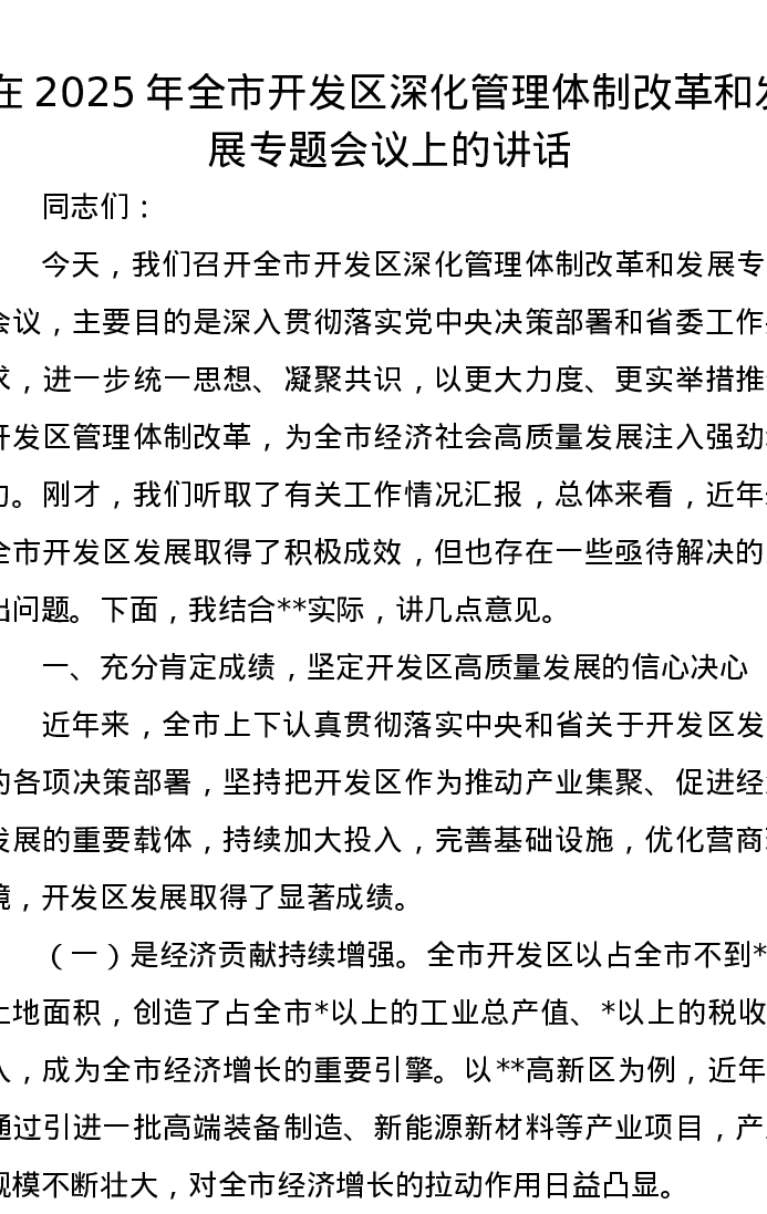在2025年全市开发区深化管理体制改革和发展专题会议上的讲话