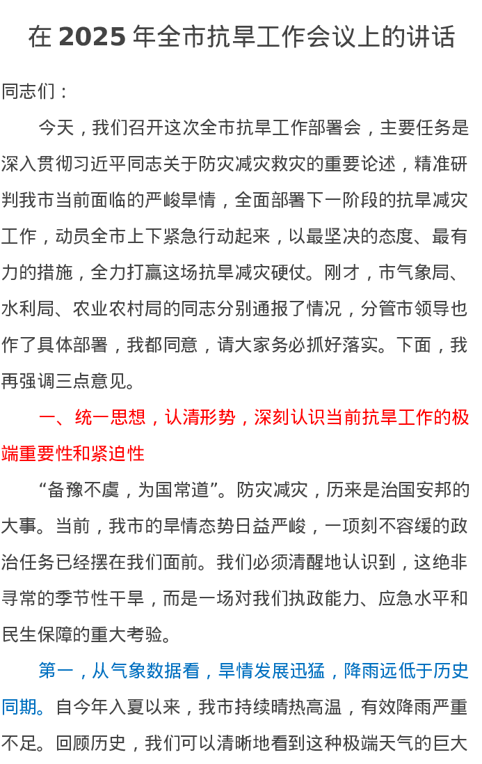 在2025年全市抗旱工作会议上的讲话