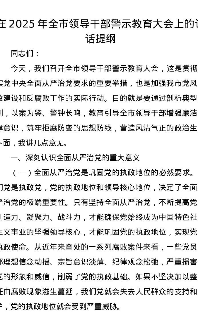 在2025年全市领导干部警示教育大会上的讲话提纲