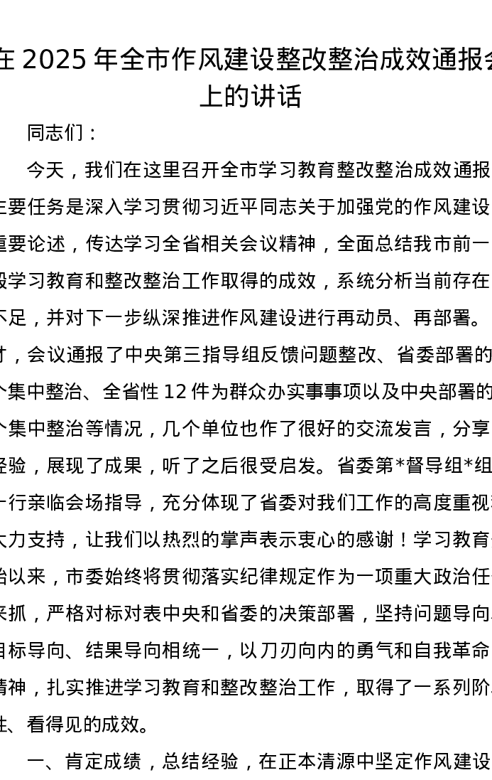 在2025年全市作风建设整改整治成效通报会上的讲话