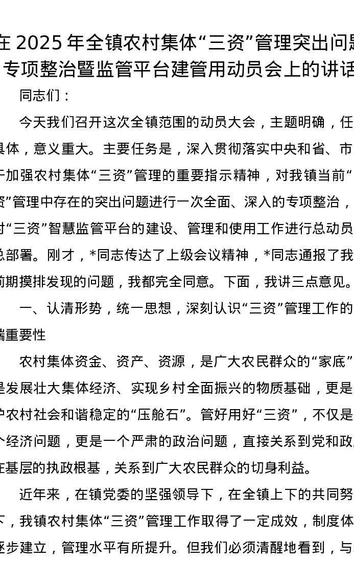 在2025年全镇农村集体三资管理突出问题专项整治暨监管平台建管用动员会上的讲话