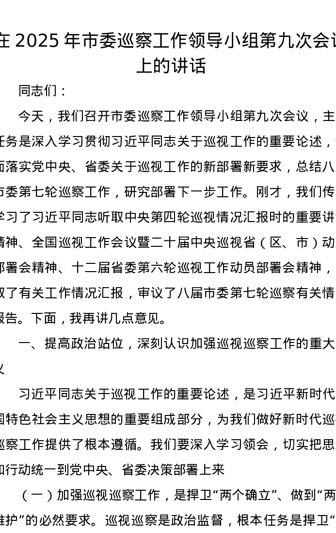 在2025年市委巡察工作领导小组第九次会议上的讲话