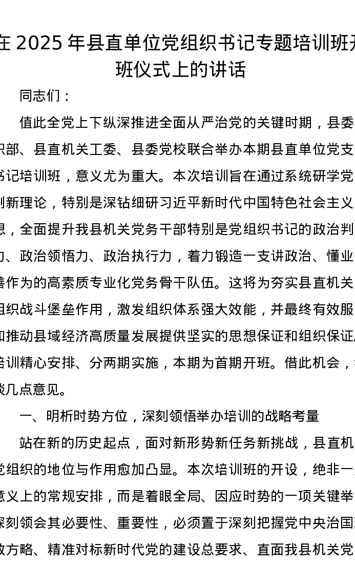 在2025年县直单位党组织书记专题培训班开班仪式上的讲话