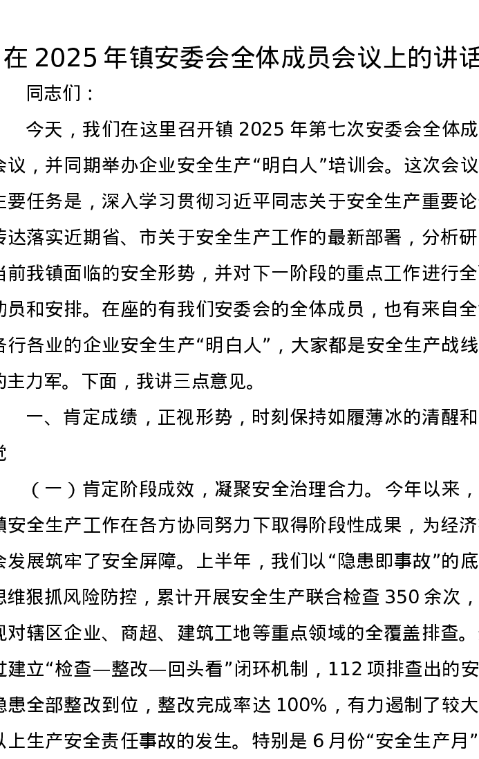 在2025年镇安委会全体成员会议上的讲话