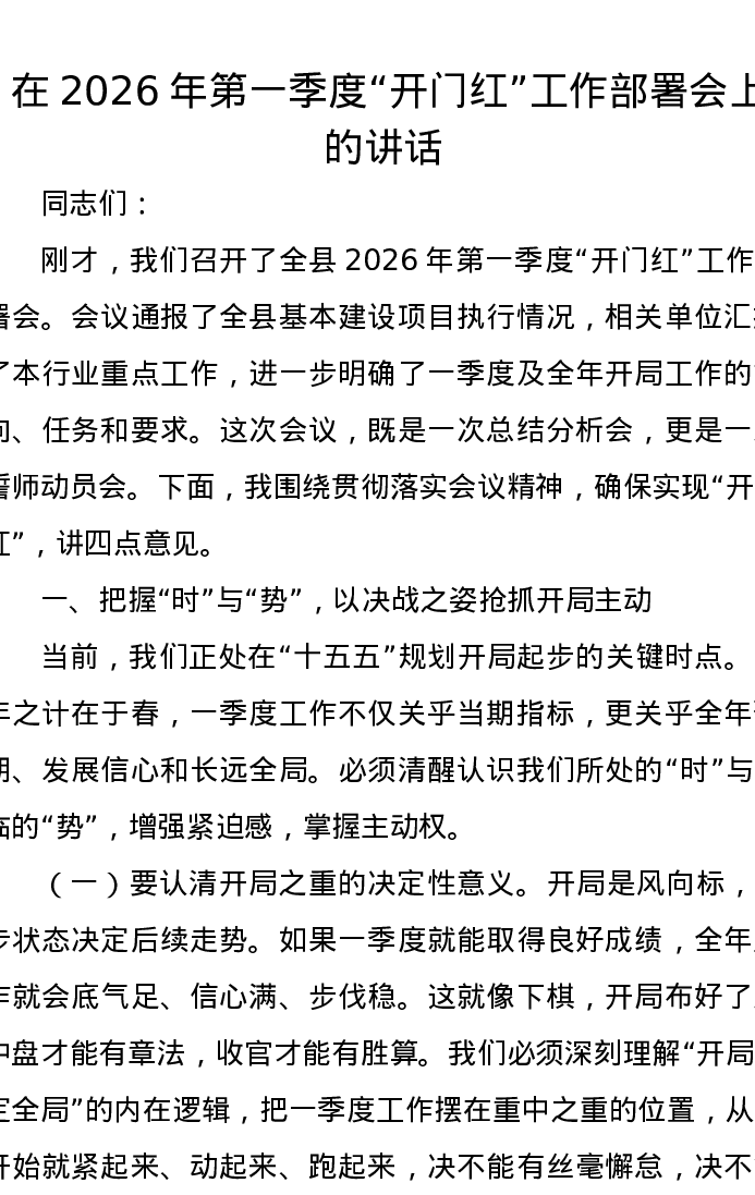 在2026年第一季度开门红工作部署会上的讲话