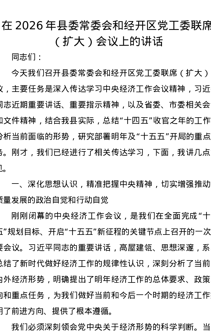 在2026年县委常委会和经开区党工委联席(扩大)会议上的讲话