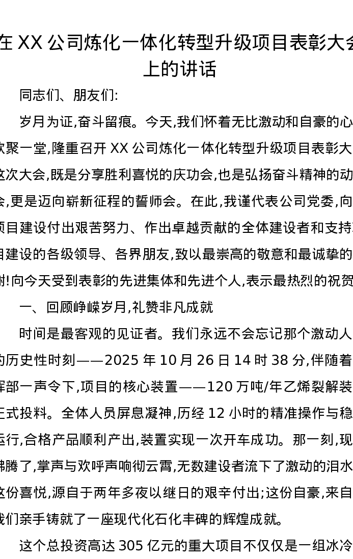 在XX公司炼化一体化转型升级项目表彰大会上的讲话