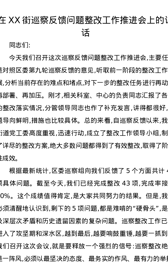 在XX街巡察反馈问题整改工作推进会上的讲话
