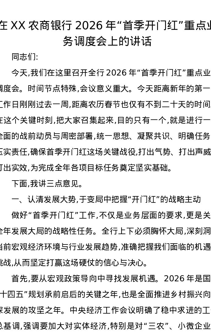 在XX农商银行2026年首季开门红重点业务调度会上的讲话
