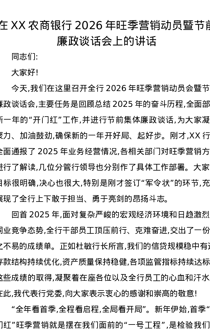 在XX农商银行2026年旺季营销动员暨节前廉政谈话会上的讲话