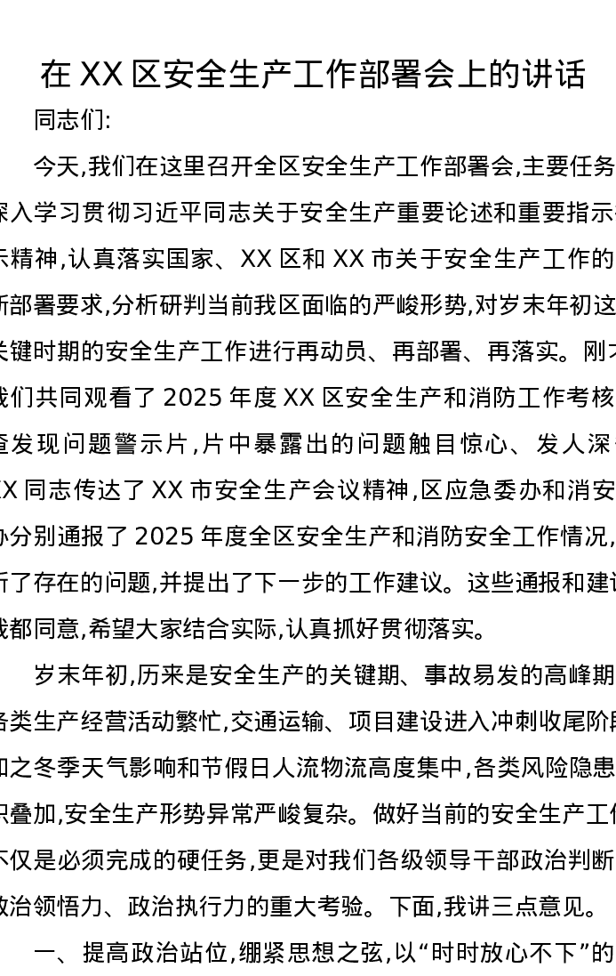 在XX区安全生产工作部署会上的讲话