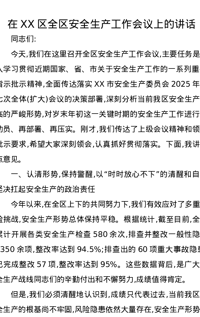在XX区全区安全生产工作会议上的讲话