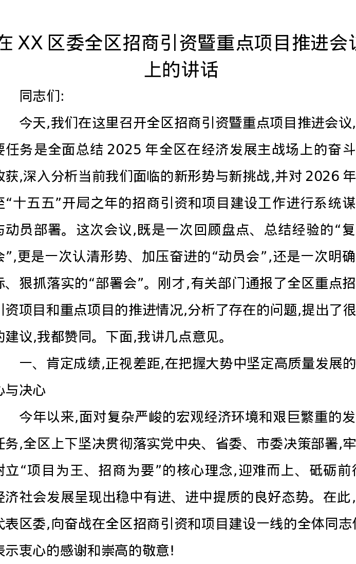 在XX区委全区招商引资暨重点项目推进会议上的讲话