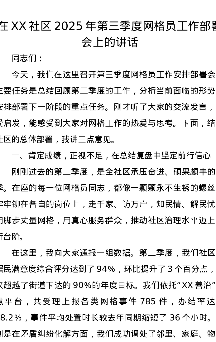 在XX社区2025年第三季度网格员工作部署会上的讲话