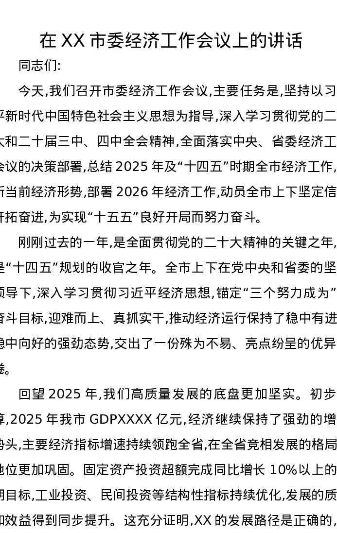在XX市委经济工作会议上的讲话