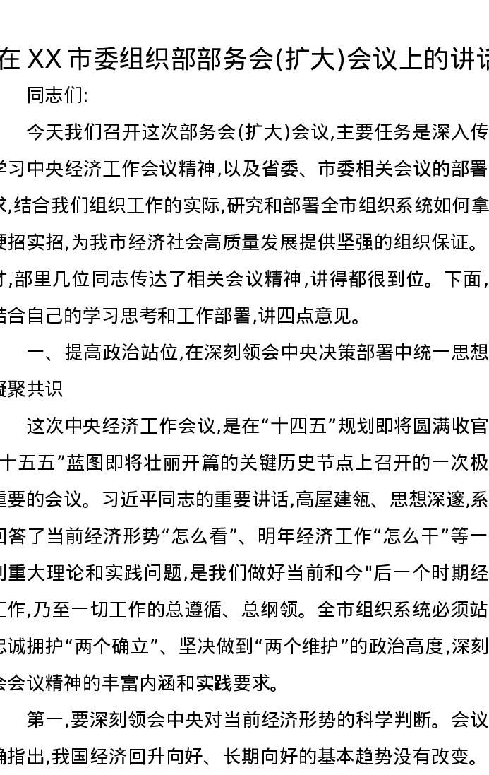 在XX市委组织部部务会(扩大)会议上的讲话