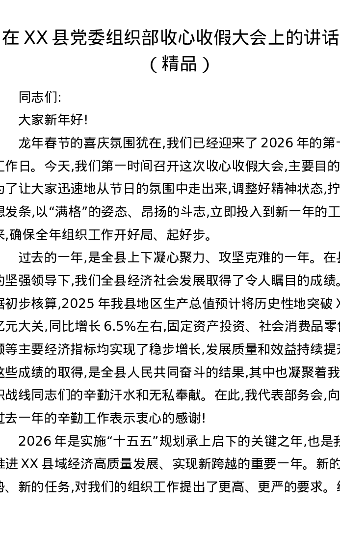在XX县党委组织部收心收假大会上的讲话稿