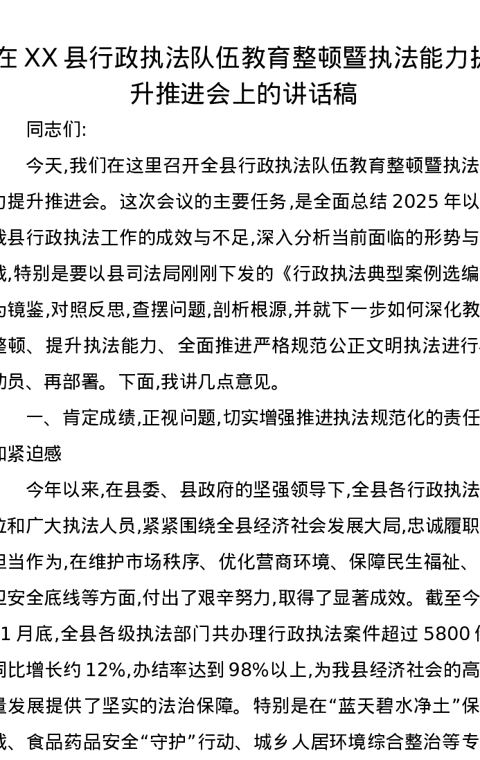 在XX县行政执法队伍教育整顿暨执法能力提升推进会上的讲话稿