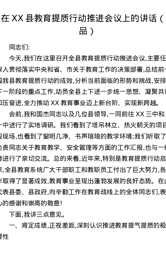 在XX县教育提质行动推进会议上的讲话
