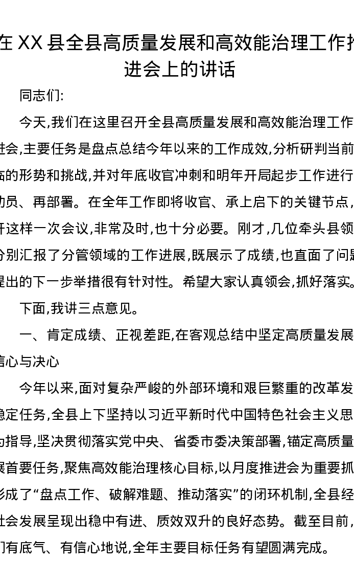 在XX县全县高质量发展和高效能治理工作推进会上的讲话