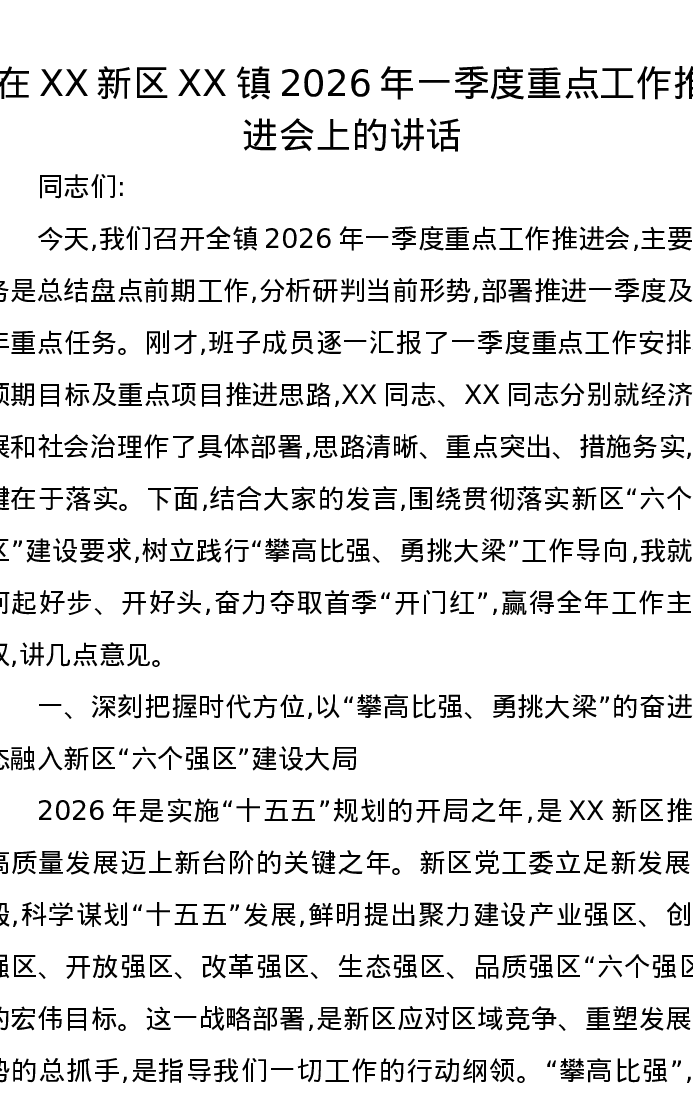 在XX新区XX镇2026年一季度重点工作推进会上的讲话