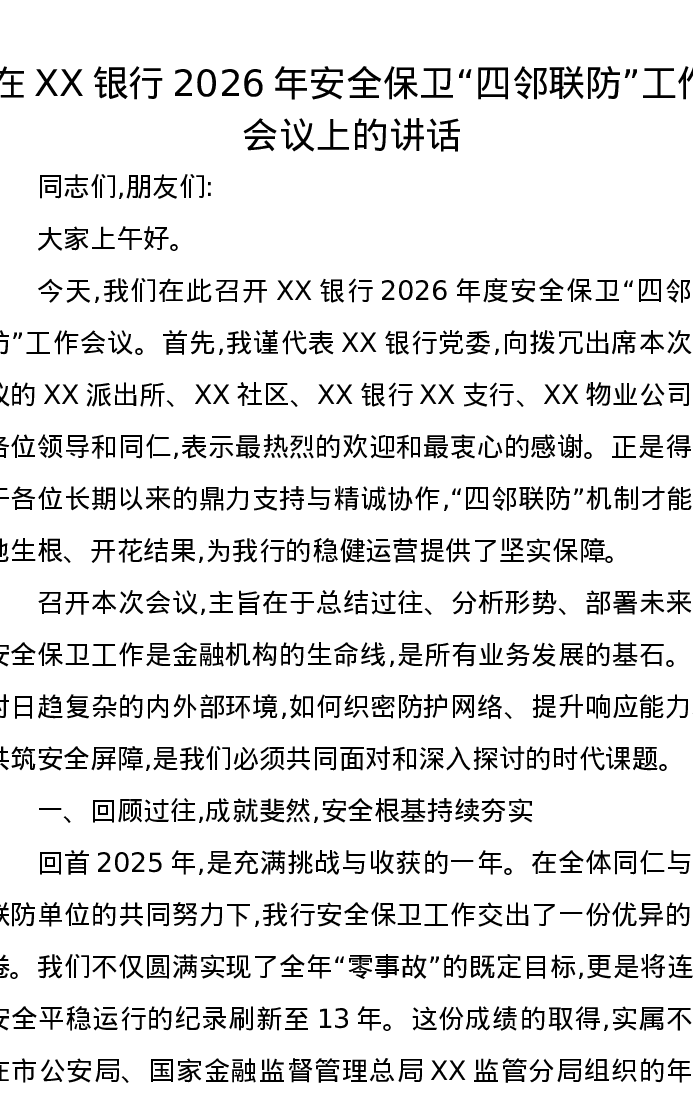 在XX银行2026年安全保卫四邻联防工作会议上的讲话