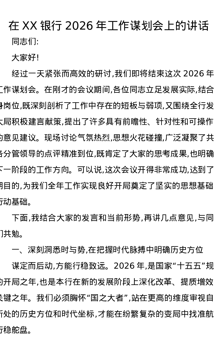 在XX银行2026年工作谋划会上的讲话
