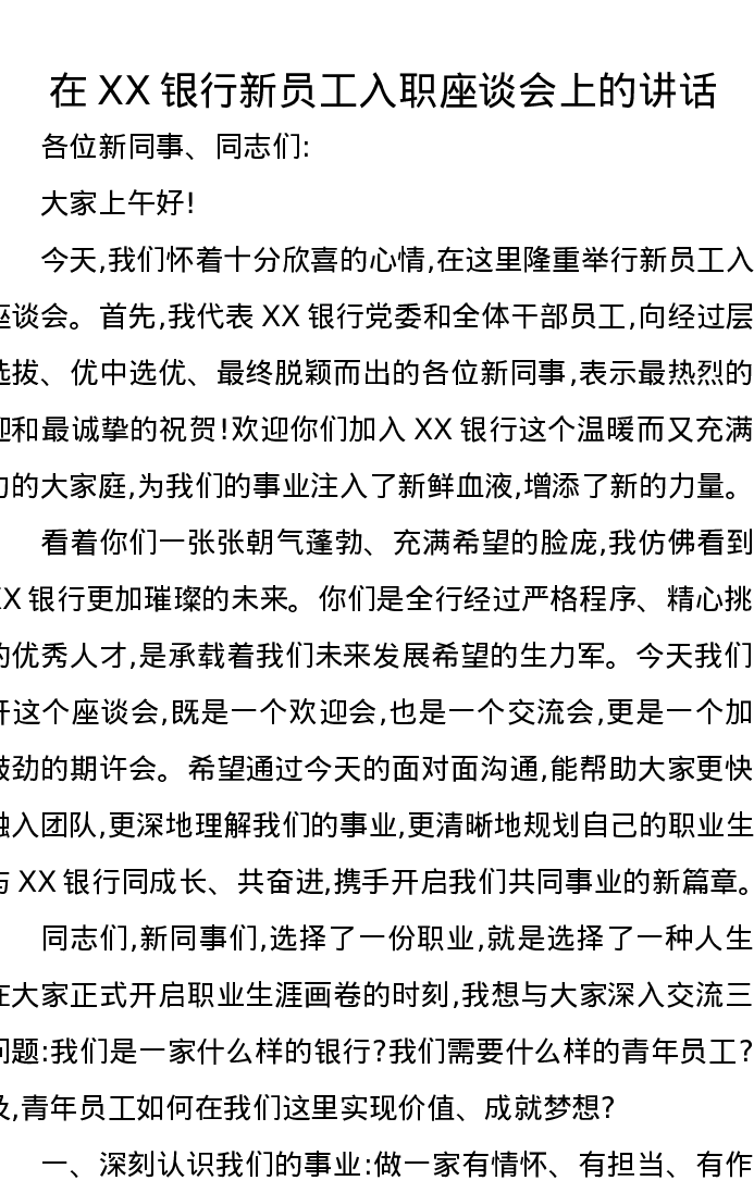 在XX银行新员工入职座谈会上的讲话