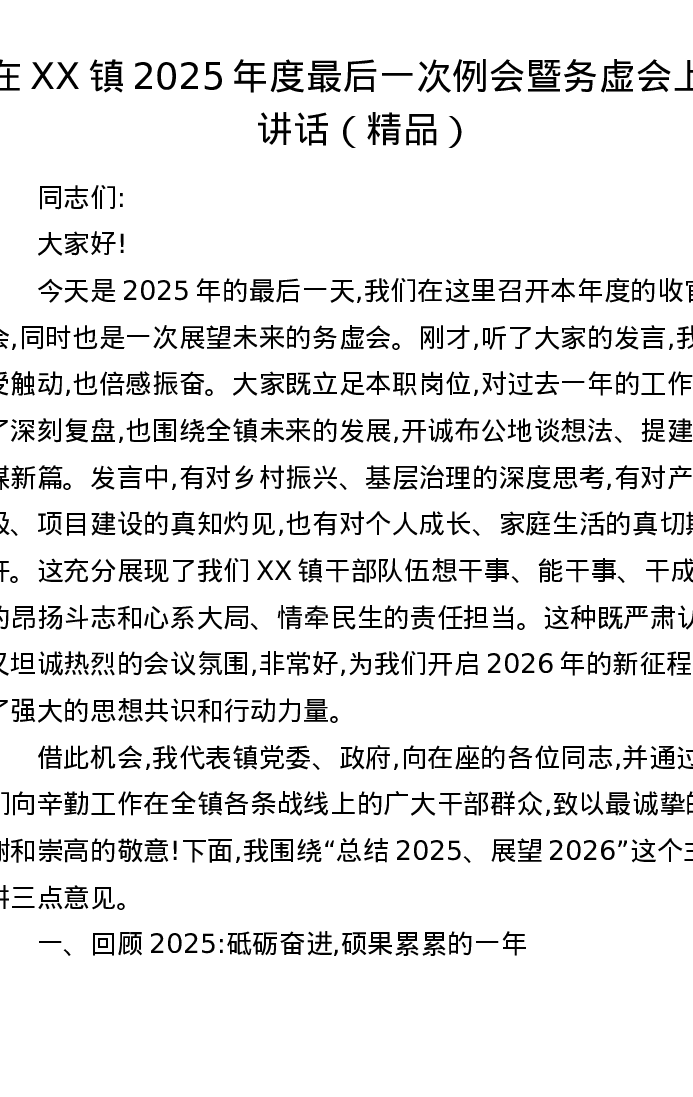 在XX镇2025年度最后一次例会暨务虚会上的讲话