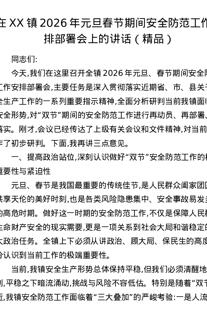 在XX镇2026年元旦春节期间安全防范工作安排部署会上的讲话