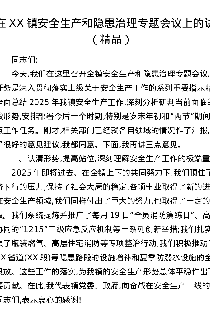 在XX镇安全生产和隐患治理专题会议上的讲话