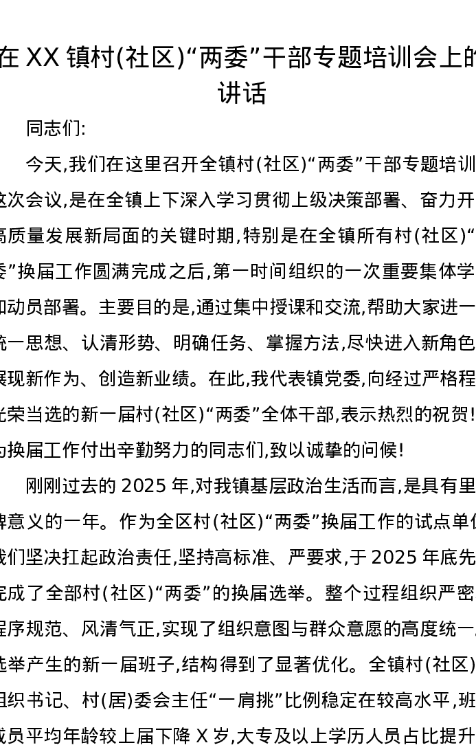 在XX镇村(社区)两委干部专题培训会上的讲话