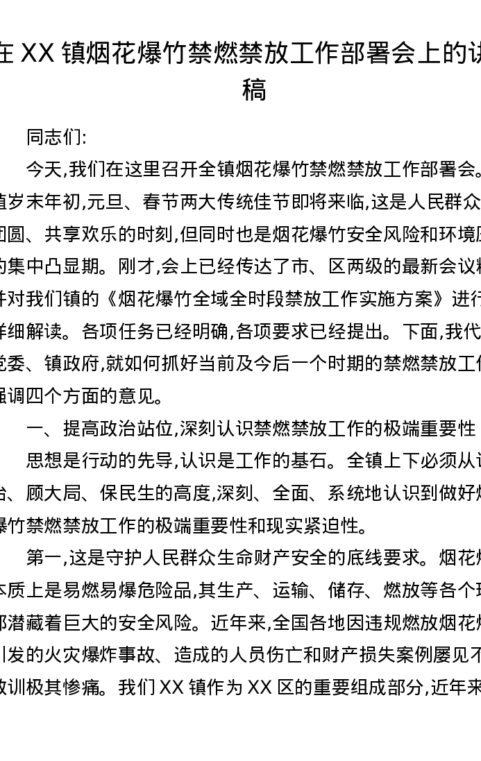 在XX镇烟花爆竹禁燃禁放工作部署会上的讲话稿