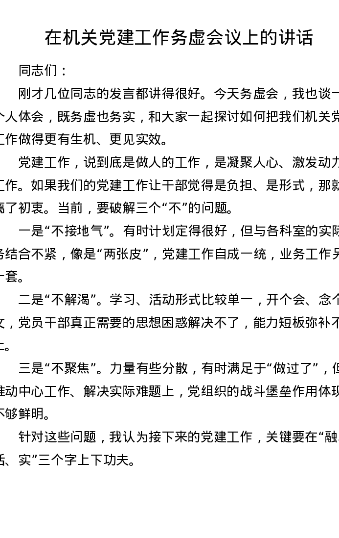 在机关党建工作务虚会议上的讲话