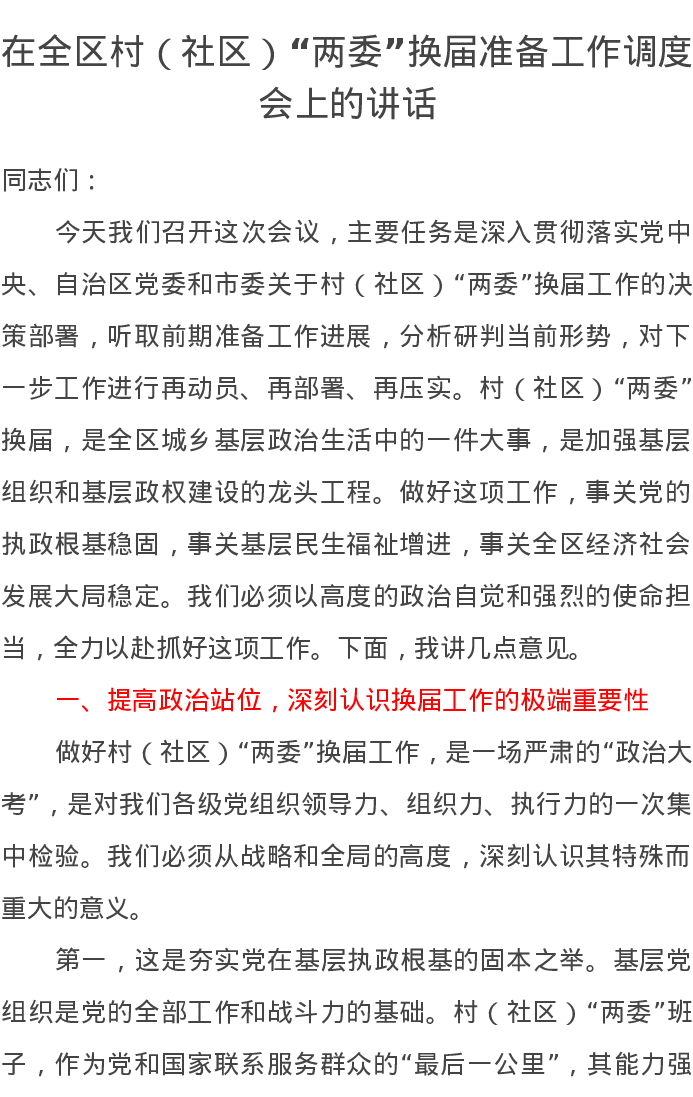 在全区村(社区)两委换届准备工作调度会上的讲话