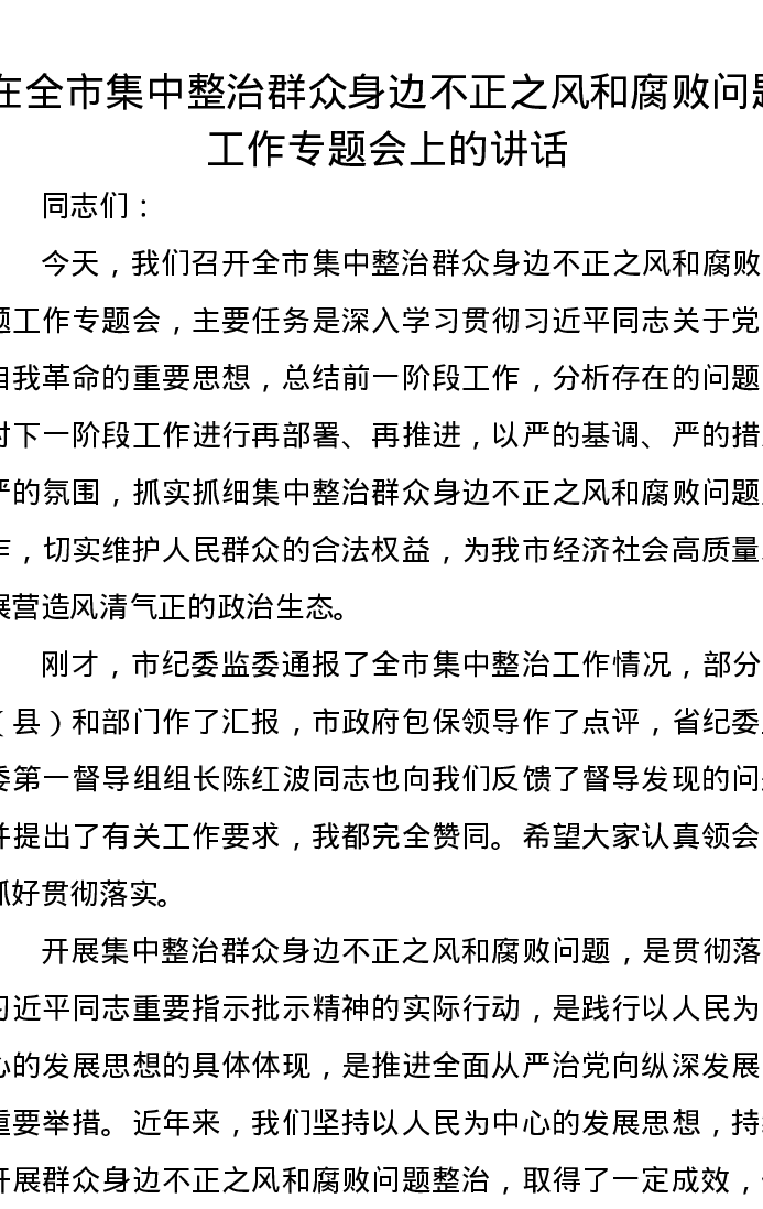 在全市集中整治群众身边不正之风和腐败问题工作专题会上的讲话