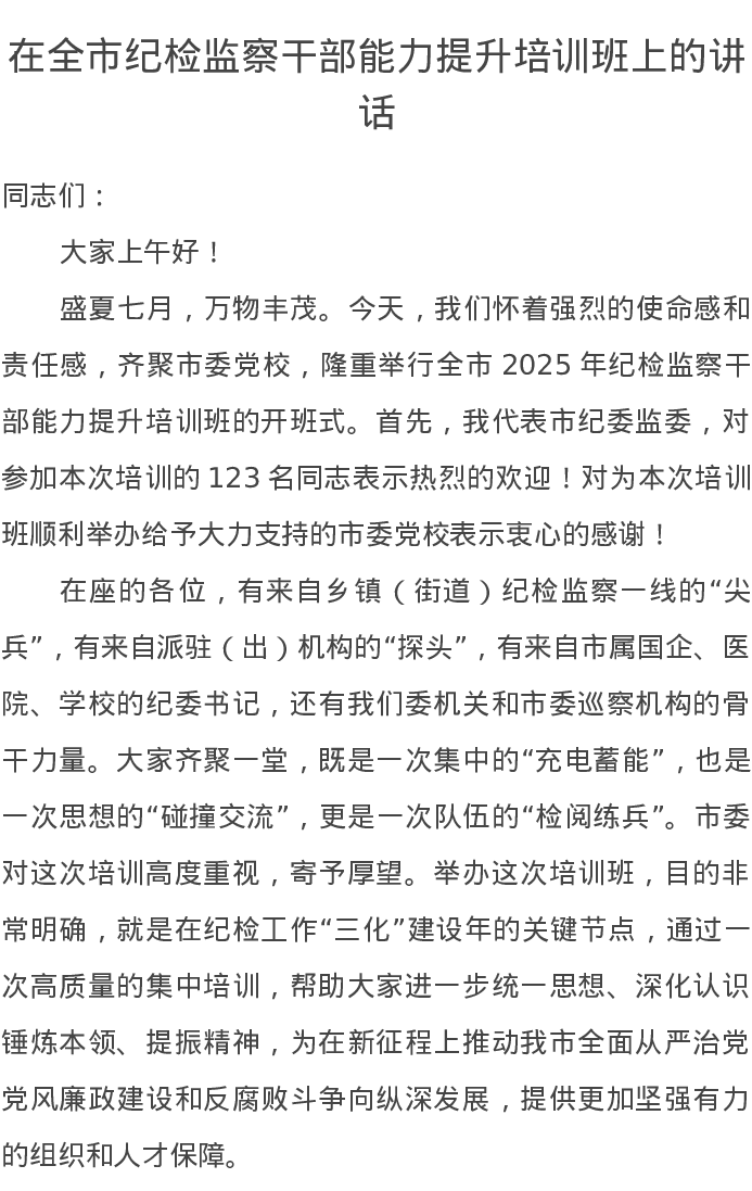 在全市纪检监察干部能力提升培训班上的讲话